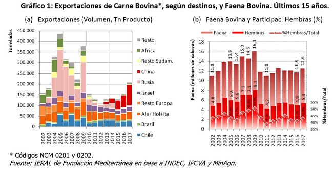El 2017 cierra con exportaciones récord de Carne Bovina en los últimos 8 años: las colocaciones rondaron las 209 mil toneladas producto, un 35% más que lo colocado en 2016, y un 57% más que lo promediado entre 2010-2015. Así, solo considerando carnes, la cadena generó US$ 1.296 millones en 2017, un 50% más que en 2015. Sin dudas, la irrupción de China como demandante de proteínas animales en los mercados internacionales ha sido determinante; el país asiático se quedó con el 46,3% de los envíos argentinos en 2017, cuando en 2012 su importancia era menor al 1%.