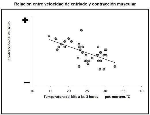 ¿Cómo hacer, entonces, para minimizar la contracción muscular? “La velocidad de descenso de la temperatura dependerá de la masa muscular y de su nivel de aislación del frío externo. Así, a una misma temperatura en cámara, cuanto mayor sea el tamaño del bife y el espesor de grasa dorsal, el corte estará más protegido, tardará más en enfriarse y, por ende, será más tierno”, aseveró. Y prosiguió: “esto explica en buena medida porqué que un animal más pesado, si es joven, dará carne más tierna que uno liviano. Posiblemente, tendrá más área de ojo de bife y mejor espesor de grasa dorsal y eso hará que se enfríe más lentamente”.