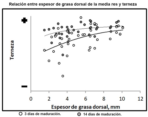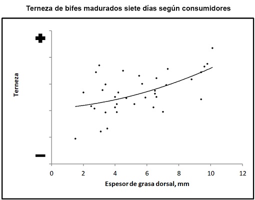 El efecto positivo del espesor de grasa dorsal sobre la terneza se confirmó con paneles de consumidores, conformados por 80 personas no entrenadas. Se evaluaron bifes provenientes de los mismos animales a los que se midió por resistencia al corte y los resultados se volcaron en un gráfico.