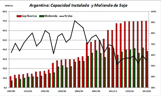 Como consecuencia, la capacidad ociosa alcanza el 45% ya que la capacidad instalada teórica de las plantas que muelen soja ronda las 70 millones de toneladas.