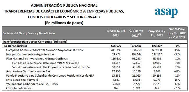 Los subsidios contemplados en el proyecto de presupuesto para el sector energético alcanzan un monto de 873.397 millones de pesos, una cifra nominal 1% menor a la del ejercicio 2021, algo que en términos reales implicaría una reducción importante si se considera una inflación prevista (en el mejor escenario) del orden del 60% para 2022.